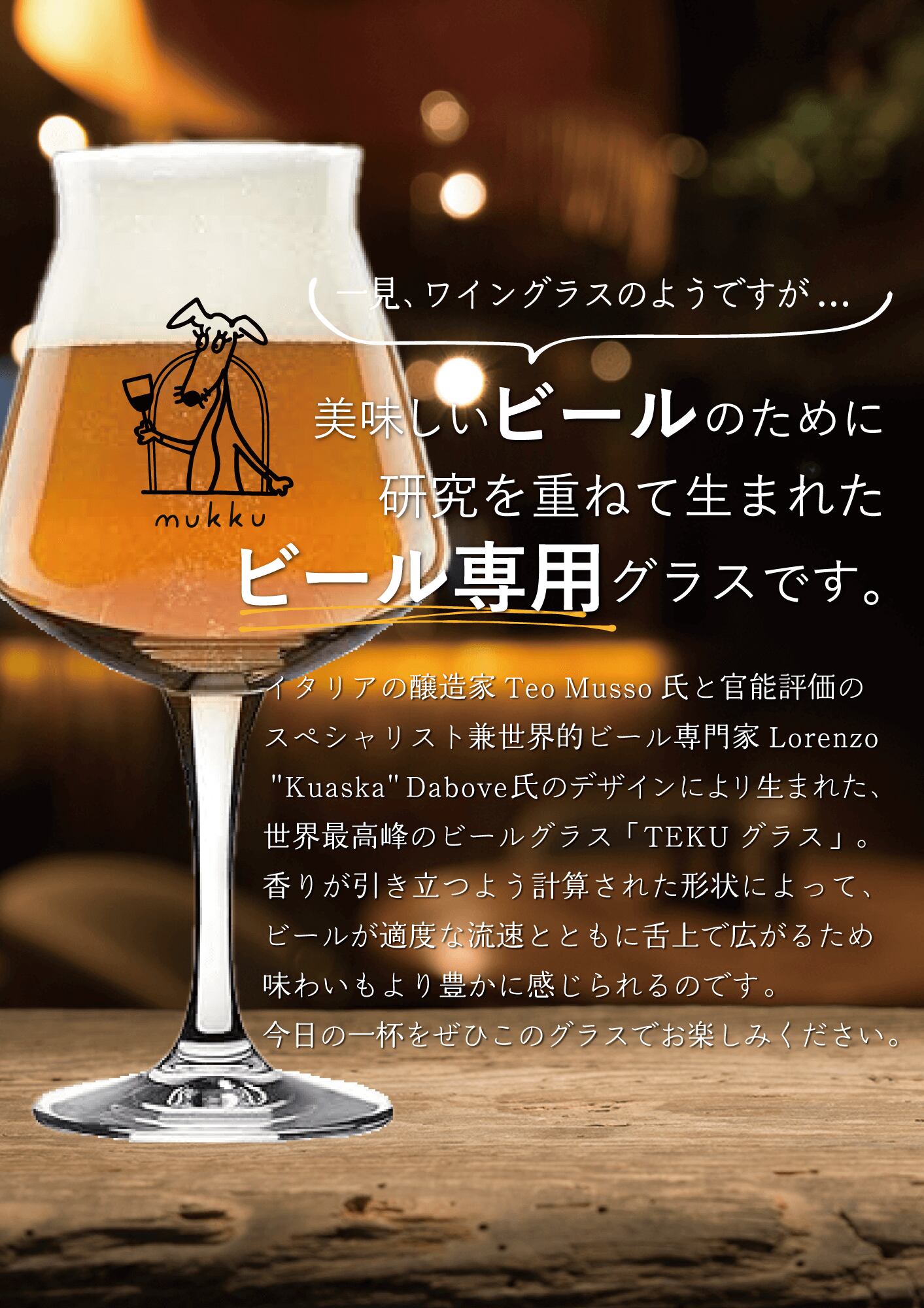 イタリアの醸造家Teo Musso氏と官能評価のスペシャリスト兼世界的ビール専門家Lorenzo "Kuaska" Dabove氏のデザインによリ生まれた、世界最高峰のビールグラス「TEKUグラス」。